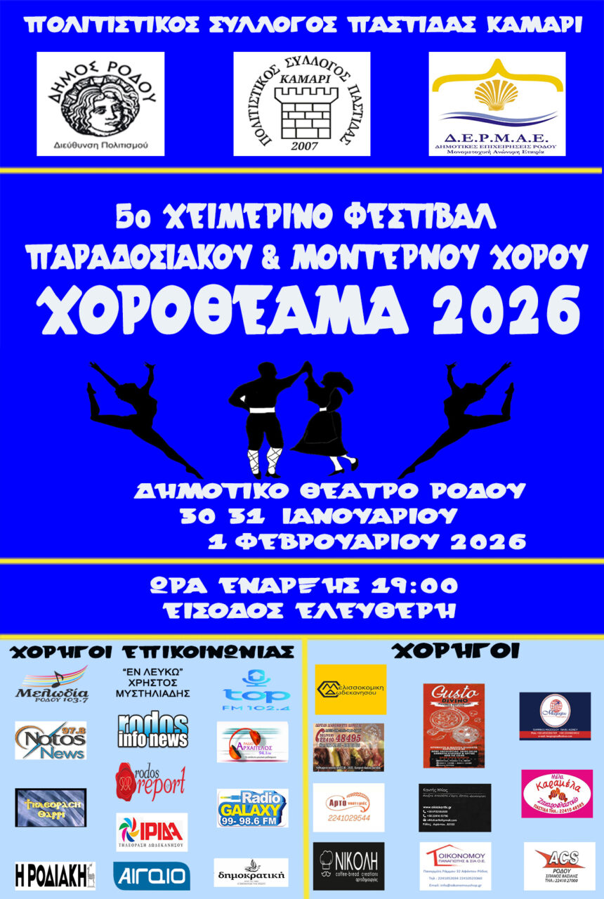 Πρόγραμμα 5ου Χειμερινού Φεστιβάλ Παραδοσιακών και Μοντέρνων Χορών 30 -31 Ιανουαρίου και 1 Φεβρουαρίου 2026 (Δημοτικό Θέατρο Ρόδου -…