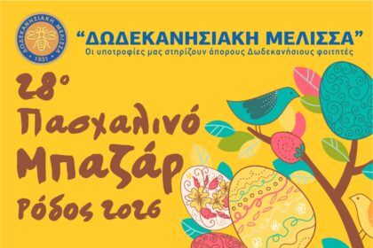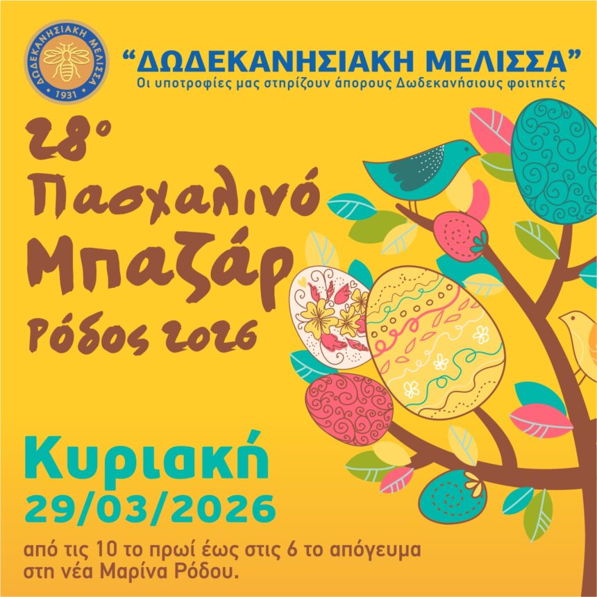 Η Δωδεκανησιακή Μέλισσα – Επιτροπή Ρόδου, διοργανώνει το 28 ο Πασχαλινό Μπαζάρ της, την Κυριακή 29 Μαρτίου 2026, στη Νέα…