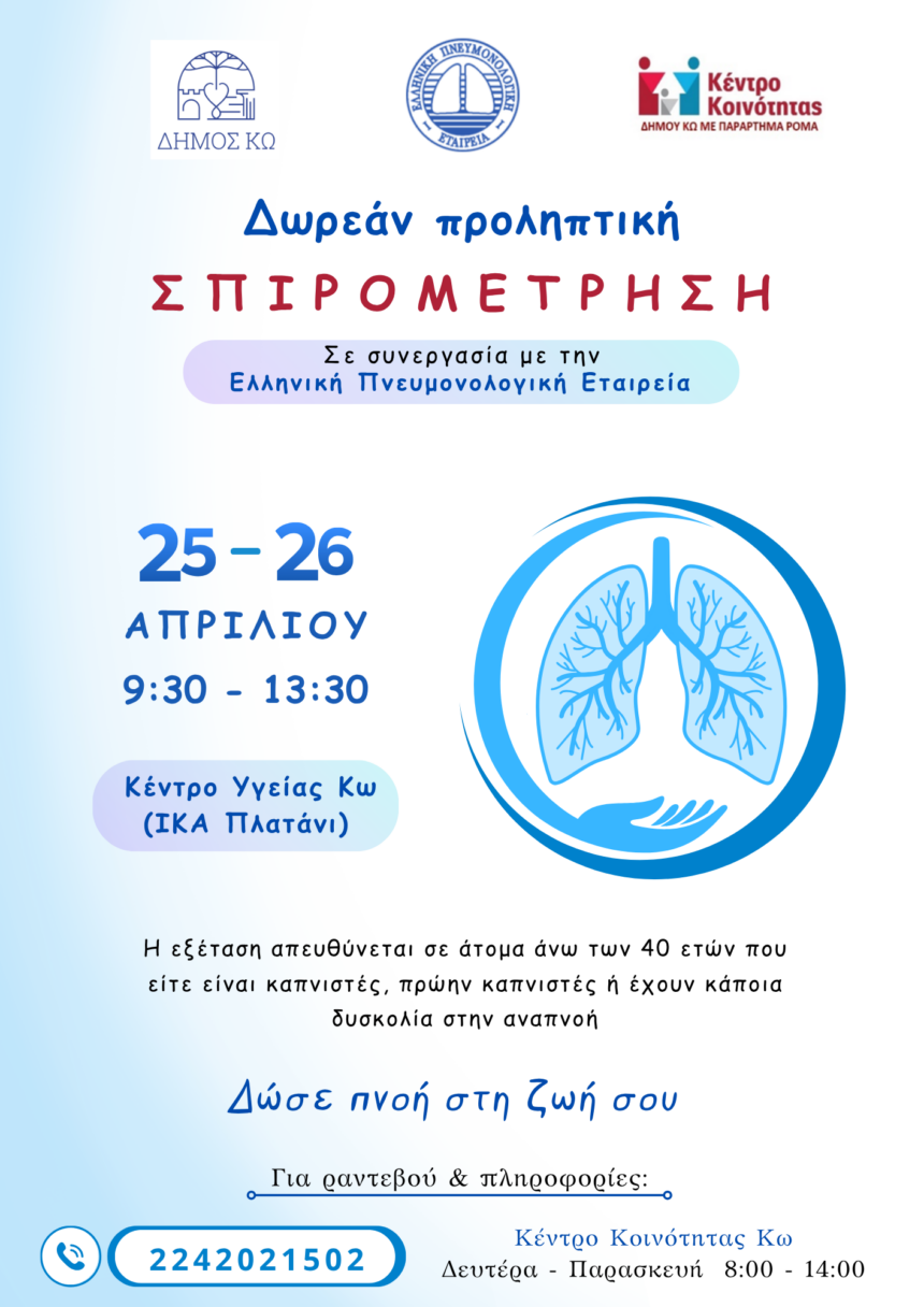 Δράση παροχής δωρεάν σπιρομετρήσεων στο Δήμο Κω, σε συνεργασία με την Ελληνική Πνευμονολογική Εταιρεία