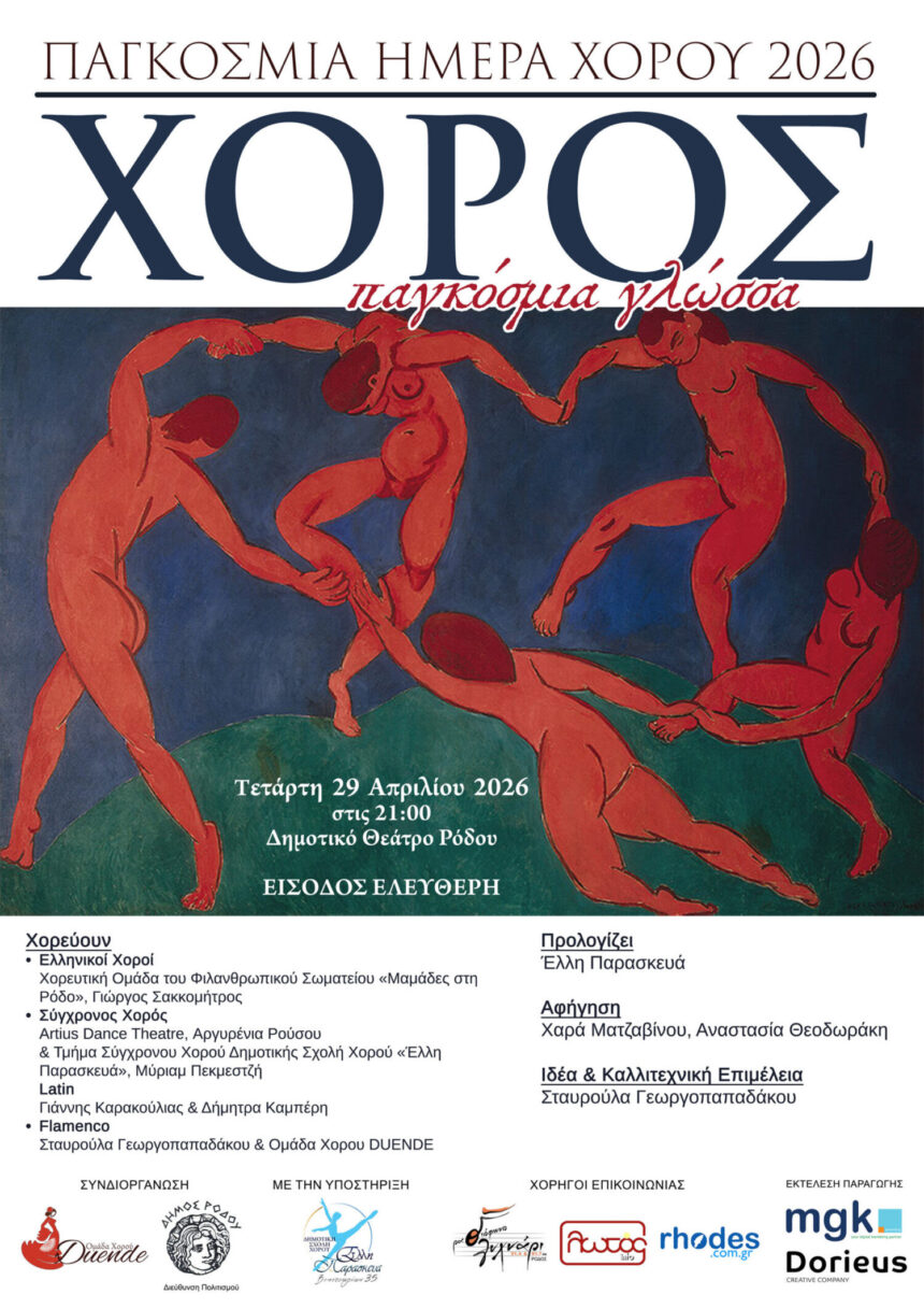 Η Ομάδα Χορού DUENDE σε συνδιοργάνωση με την Διεύθυνση Πολιτισμού του Δήμου Ρόδου, παρουσιάζουν την Τετάρτη, 29 Απριλίου 2026, στις 21:00, μία μοναδική παράσταση, ανοικτή στο κοινό, με αφορμή την Παγκόσμια Ημέρα Χορού 2026 με τίτλο «Χορός: Παγκόσμια Γλώσσα».