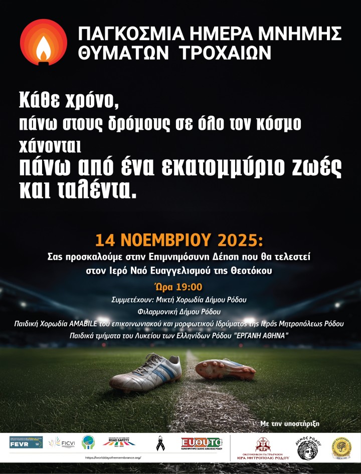 Η ΕΥΘΥΤΑ Ρόδου ενημερώνει ότι η Παγκόσμια Ημέρα Μνήμης Θυμάτων Τροχαίων Δυστυχημάτων είναι μια παγκόσμια εκδήλωση που πραγματοποιείται κάθε χρόνο την τρίτη Κυριακή του Νοεμβρίου. Αποτελεί μια δημόσια αναγνώριση των καταστροφικών επιπτώσεων που έχουν οι θάνατοι και οι τραυματισμοί από τροχαία στις οικογένειές τους.