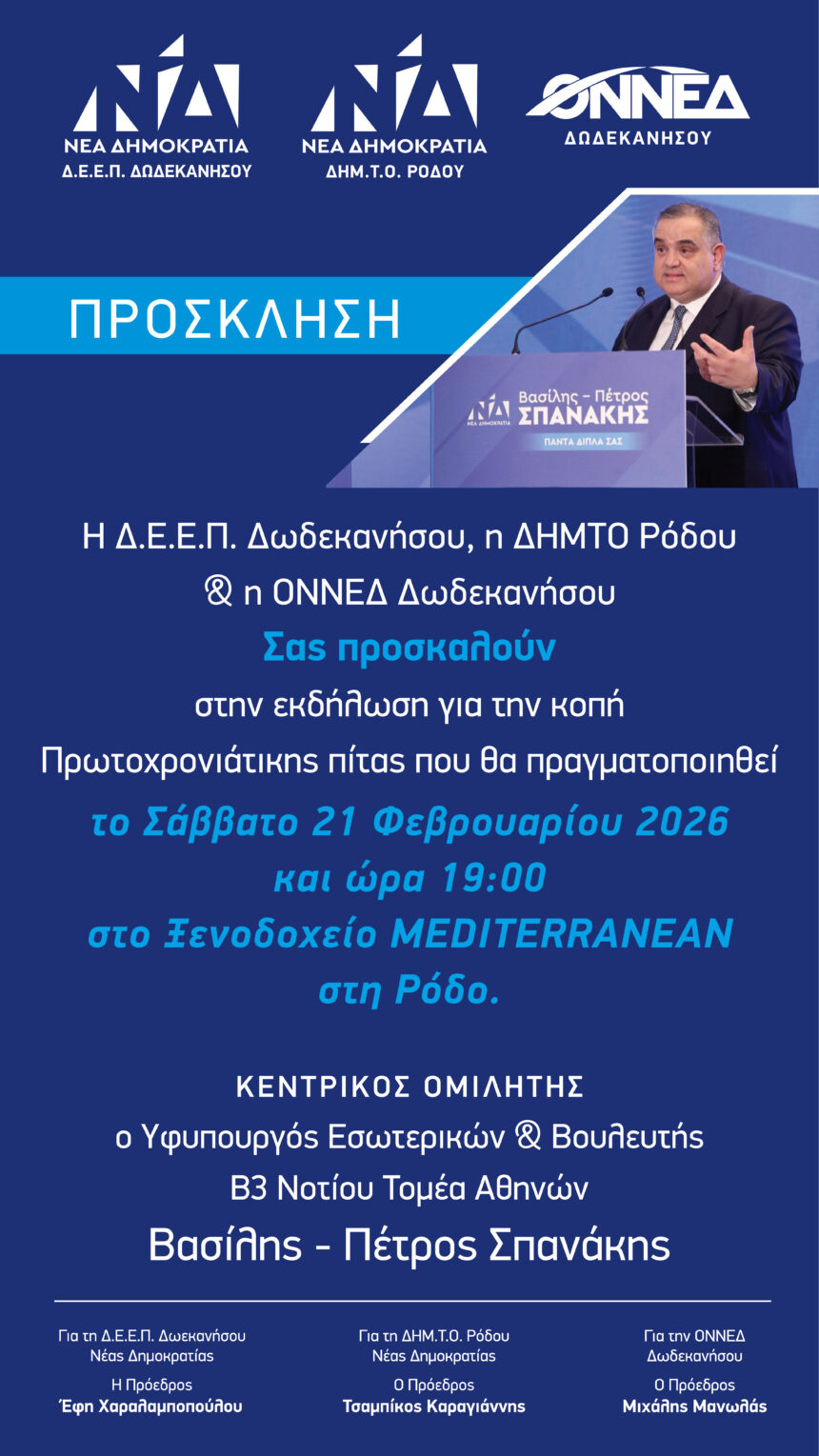 ΡΟΔΟΣ ΠΡΟΣΚΛΗΣΗ ΣΕ ΚΟΠΗ ΠΡΩΤΟΧΡΟΝΙΑΤΙΚΗΣ ΠΙΤΑΣ ΔΕΕΠ,ΔΗΜΤΟ,ΟΝΝΕΔ Last updated: 20/02/2026 19:03 notosnews Share SHARE ΕΚΑΒ ΡΟΔΟΥ – Όταν η άγνοια γίνεται… πρόταση “λύσης” στις ανάγκες ζωής και θανάτου Νέα δέσμη χρηματοδοτήσεων 3,5 εκατ. ευρώ για την αντιμετώπιση της λειψυδρίας στα νησιά Κοινή επιστολή φορέων στον Πρωθυπουργό για την έλλειψη γιατρού στο αεροδρόμιο «Διαγόρας» «Με επιτυχία παρουσιάστηκε το RhodesMRC 2025 στην Αθήνα» Γ.Νικητιάδης : Ανασχηματισμός. Ξανά πλήρης αδιαφορία της Ν.Δ. για τα νησιά μας Share This Article Facebook Copy Link Print Share Previous Article Στη Ρόδο θα χτυπάει για μία ακόμη χρονιά η καρδιά του παγκόσμιου τένις Next Article Πρόγραμμα Περιφερειακών Υποτροφιών από το Κολλέγιο Αθηνών: Συμμετοχή μαθητών της Περιφέρειας Νοτίου Αιγαίου Stay Connected4.4KFollowersFollow - Advertisement - Latest News «Οχι» από το Ανώτατο Δικαστήριο των ΗΠΑ στους δασμούς Τραμπ: Ο πρόεδρος δεν έχει δικαίωμα να τους επιβάλει, «ντροπή» λέει ο ίδιος ΚΟΣΜΟΣ ΤΕΛΕΥΤΑΙΑ ΑΡΘΡΑ 20/02/2026 Συναντήσεις του Αντιπεριφερειάρχη Πρωτογενούς Τομέα Φιλήμονα Ζαννετίδη με φορείς του πρωτογενούς τομέα σε Κω, Κάλυμνο, Λέρο και Σαντορίνη ΔΩΔΕΚΑΝΗΣΑ ΤΕΛΕΥΤΑΙΑ ΑΡΘΡΑ 20/02/2026 Συνάντηση Δημάρχου Θεοδόση Νικηταρά στην Κέφαλο, Τρίτη, 24 Φεβρουαρίου ΔΩΔΕΚΑΝΗΣΑ ΤΕΛΕΥΤΑΙΑ ΑΡΘΡΑ 20/02/2026 Πρόγραμμα Περιφερειακών Υποτροφιών από το Κολλέγιο Αθηνών: Συμμετοχή μαθητών της Περιφέρειας Νοτίου Αιγαίου ΡΟΔΟΣ ΤΕΛΕΥΤΑΙΑ ΑΡΘΡΑ 20/02/2026