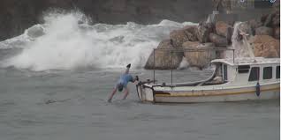 Ωστόσο, η περιπέτεια δεν τελειώνει εκεί. Αδυνατώντας να πηδήξει με ασφάλεια στη στεριά λόγω της σφοδρής θαλασσοταραχής, παίρνει τη δύσκολη απόφαση να βγάλει τα ρούχα του και να πέσει στη θάλασσα, κολυμπώντας μέχρι την ακτή. Οι εικόνες κόβουν την ανάσα, καθώς για λίγα δευτερόλεπτα χάνεται μέσα στους αφρούς. Ευτυχώς, ο έμπειρος ψαράς καταφέρνει τελικά να βγει σώος στη στεριά.